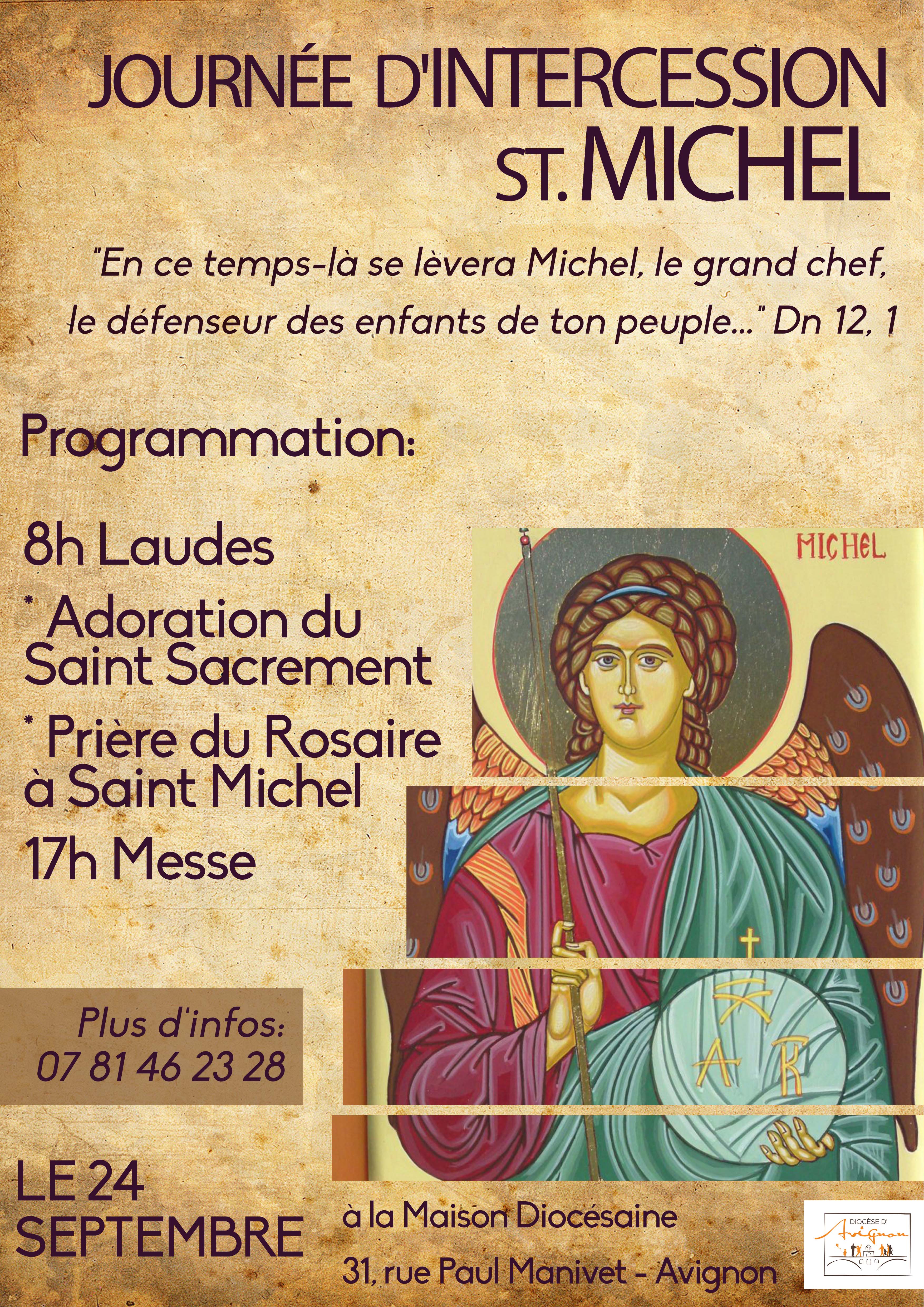 Accueil » Nos archives » Agenda – Le diocèse d’Avignon propose une journée d’intercession à Saint Michel Église en France Agenda – Le diocèse d’Avignon propose une journée d’intercession à Saint Michel Le samedi 24 septembre à la maison diocésaine, de 8h à 18h. Au programme : laudes, adoration du Saint Sacrement, prière du rosaire à saint Michel et messe. Plus d’informations sur le site du diocèse. Article précédentInfo - ONU - Rapport sur le développement et le commerce - Le Saint-Siège rappelle l'inportance du développement intégral Article suivantAgenda - Veillée "miséricorde divine" à l'église Sainte Pazanne (diocèse de Nantes) 22 septembre 2016
