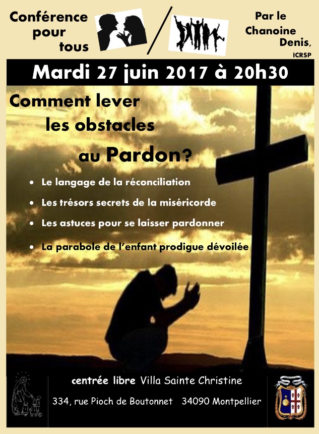 Accueil » Nos archives » Agenda: Conférence sur le Pardon à Montpellier le 27 juin Summorum Pontificum Agenda: Conférence sur le Pardon à Montpellier le 27 juin Le Chanoine Alban Denis, Institut du Christ Roi, donne une conférence pour tous à Montpellier le mardi 27 juin : ICRSP Montpellier Article précédentUn nouveau logo pour le diocèse de Laval Article suivantLe mois béni de Ramadan... 25 juin 2017
