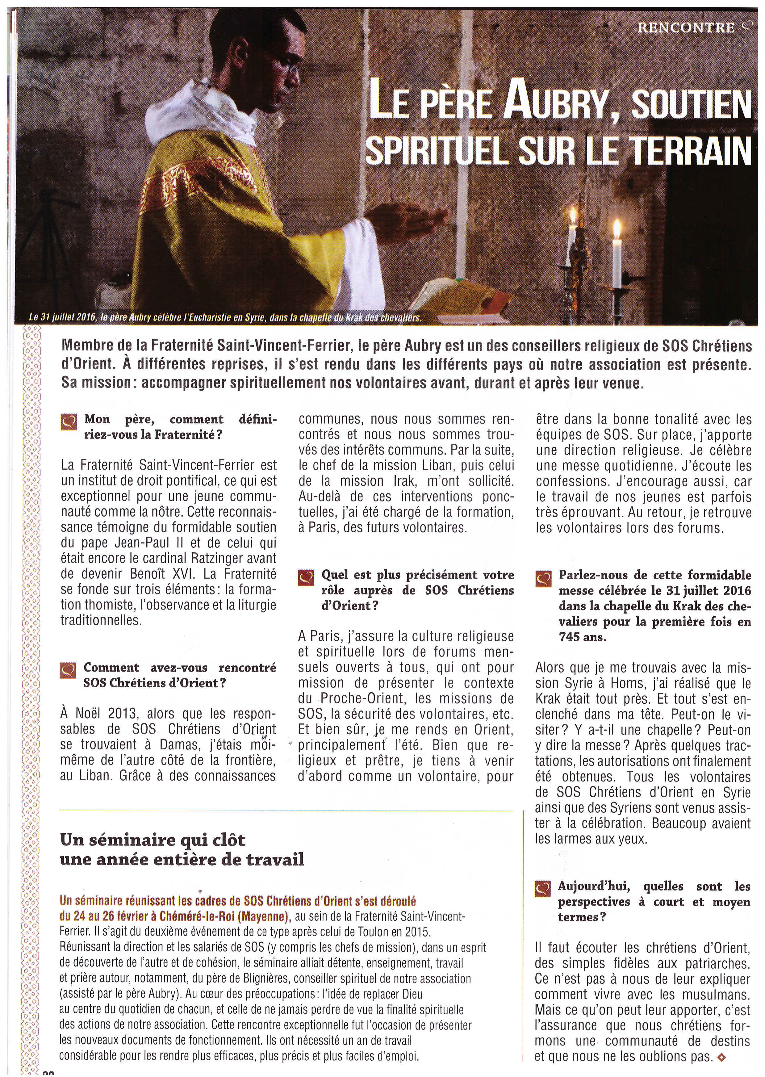 Accueil » Nos archives » Au service de SOS de Chrétiens d’Orient En Une Au service de SOS de Chrétiens d’Orient Dans le dernier numéro de la Lettre d’information des Donateurs de SOS Chrétiens d’Orient (n°8), on peut lire une interview du Père Aubry, Fraternité Saint-Vincent Ferrier, un des conseillers religieux de SOS Chrétiens d’Orient. Oeuvre à soutenir : SOS Chrétiens d’Orient Article précédentCongrégation pour la doctrine de la foi: le cardinal Müller ne serait pas reconduit dans ses fonctions Article suivantLes travaux de l'église conventuelle de la Fraternité Saint-Vincent Ferrier 30 juin 2017