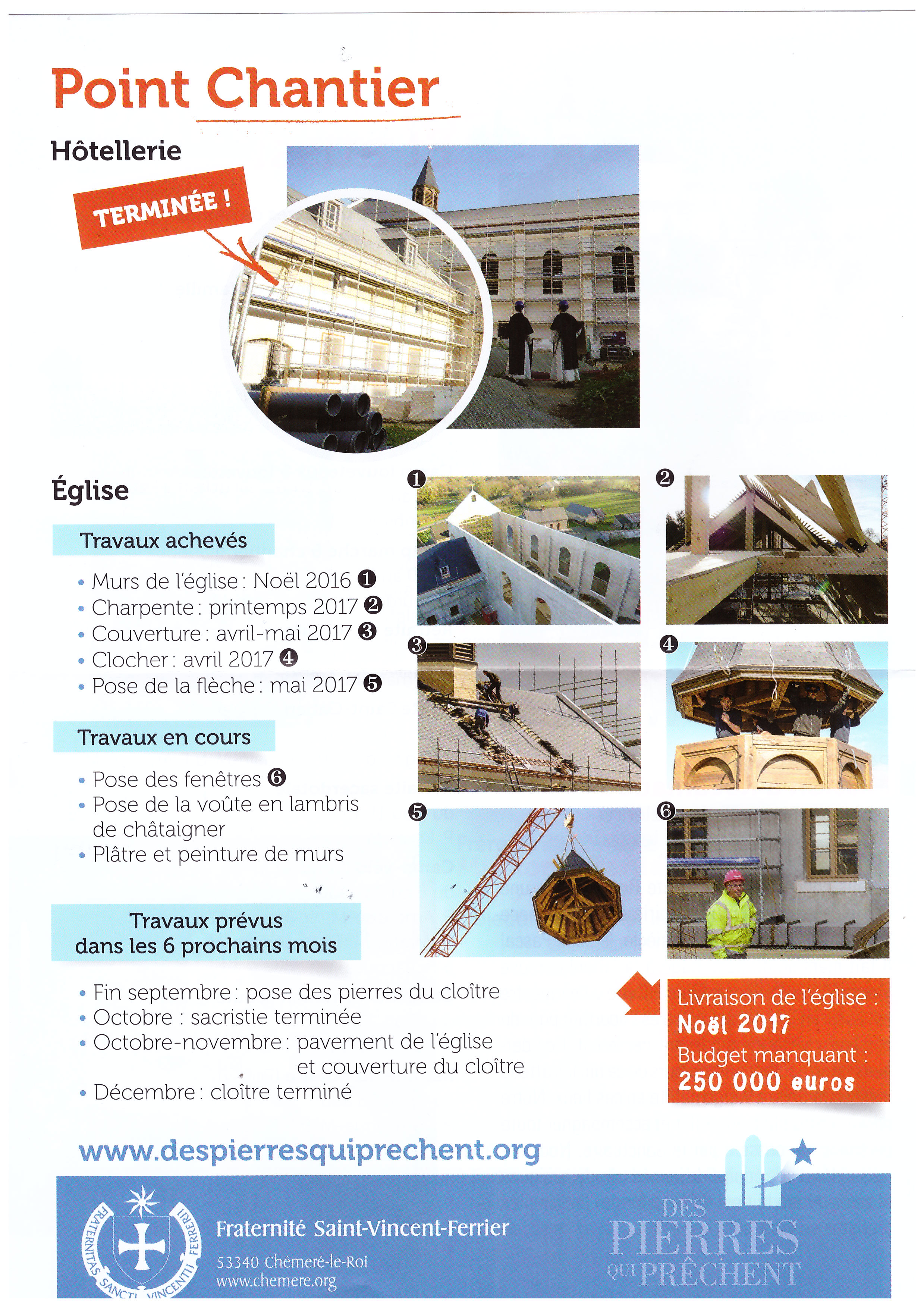 Accueil » Nos archives » Les travaux de l’église conventuelle de la Fraternité Saint-Vincent Ferrier En Une Les travaux de l’église conventuelle de la Fraternité Saint-Vincent Ferrier La construction de l’église conventuelle du Couvent Saint-Thomas d’Aquin (Chémeré-le-Roi) se poursuit : Des pierres qui prêchent Article précédentAu service de SOS de Chrétiens d'Orient Article suivantUne messe dans la forme extraordinaire à Luçon (Vendée) cet été 1 juillet 2017