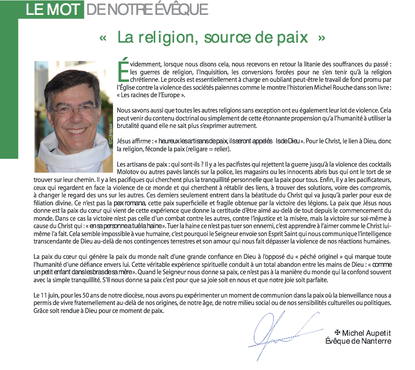 Accueil » Nos archives » La religion source de paix Perepiscopus La religion source de paix Article précédentCélébrations du Pardon de Notre-Dame-de-Bon-Secours Article suivantL'étrange rite de Mgr Fonlupt 3 juillet 2017
