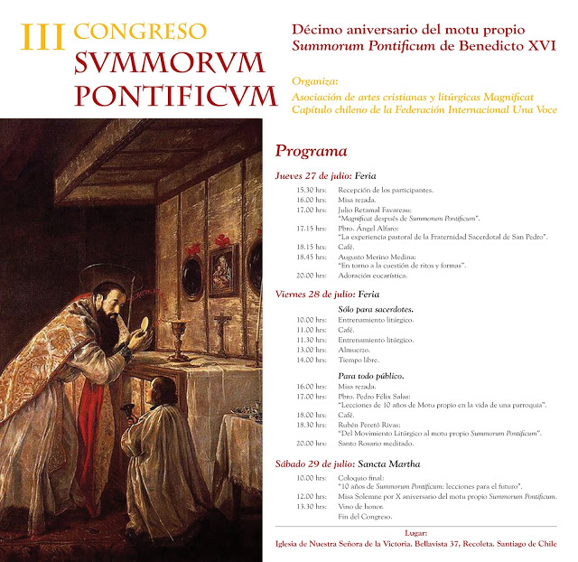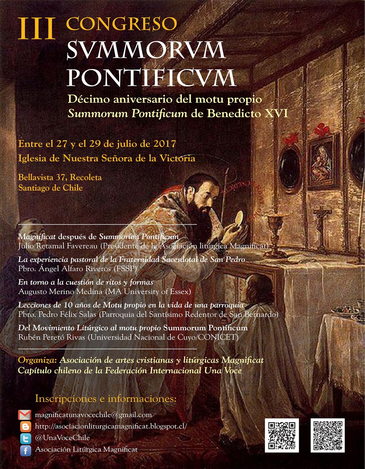 Accueil » Nos archives » 3è Congrès Summorum Pontificum au Chili Summorum Pontificum 3è Congrès Summorum Pontificum au Chili A l’occasion du 10è anniversaire du Motu Proprio Summorum Pontificum, l’Association Liturgicam Magnificat (Una Voce Chili) organise son 3è congrès Summorum Pontificum au Chili du 27 au 29 juillet à Santiago du Chili autour de 5 conférences. Association Liturgicam Magnificat Article précédentLettre pastorale «Accueil et hospitalité sur le chemin de Saint-Jacques» Article suivantOrdre de Malte : le changement ! 19 juillet 2017