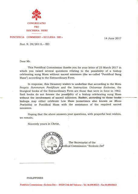 Nous avons reçu la réponse (datée du 14 juin 2017) il y a deux semaines. La Commission Pontificale Ecclesia Dei précise que les livres à utiliser pour la forme extraordinaire, selon Summorum Pontificum, sont ceux en vigueur en 1962. En 1962, un évêque avait la possibilité de célébrer une Messe pontificale basse ou une messe pontificale solennelle. La possibilité de célébrer une messe chantée (sans ministres sacrés) a été ouverte seulement aux évêques par le décret Inter Œcumenici, délivré par la Sacrée Congrégation des Rites, datée du 26 septembre 1964. Universæ Ecclesiæ, sur la discipline liturgique, précise que, « en raison de son caractère de droit spécial, le Motu Proprio Summorum Pontificum déroge à ces dispositions de la Loi, liée aux Rites sacrés, promulguées depuis 1962 et incompatibles avec les rubriques des livres liturgiques en vigueur en 1962 ». En conséquence, le décret Inter Œcumenici n’est pas applicable à la forme extraordinaire.