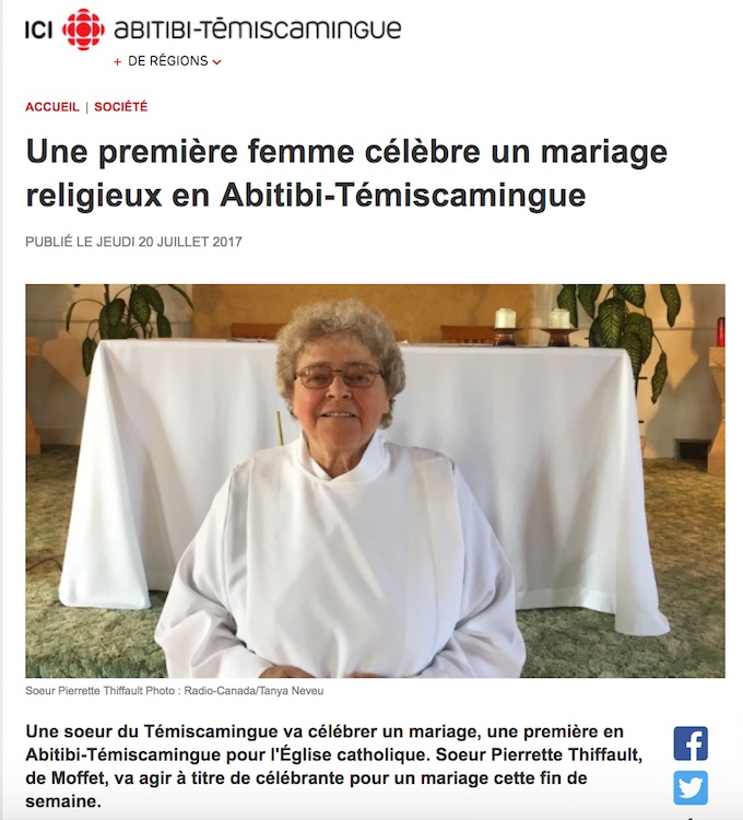 « Une sœur du Témiscamingue va célébrer un mariage, une première en Abitibi-Témiscamingue pour l’Église catholique. Sœur Pierrette Thiffault, de Moffet, va agir à titre de célébrante pour un mariage cette fin de semaine. Pierrette Thiffault s’est engagée auprès des sœurs catholiques de la Providence il y a 55 ans, mais jamais elle n’aurait pensé un jour célébrer un mariage ». La religieuse précise pourtant bien à Radio Canada qu’elle ne peut pas marier. « Je ne suis pas ordonnée et ce n’est pas dans ma fonction », rien n’y fait, Radio Canada persévère : « Pourtant, elle a reçu le 23 mai dernier une lettre qui confirme qu’elle peut présider un mariage. C’est la Congrégation du Culte divin et de la Discipline des sacrements de Rome qui lui en donne l’autorisation ».