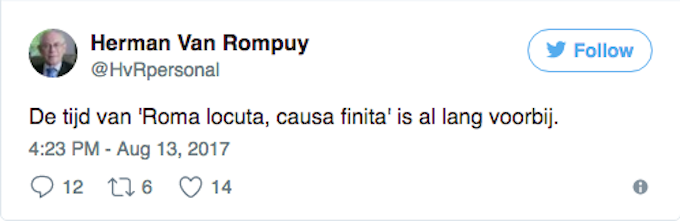 Ancien Premier ministre belge (2008-2009) puis premier président du Conseil européen (2010-2014), Herman Van Rompuy n’est pas d’accord avec la récente mise au point disciplinaire du pape François envers les quinze centres psychiatriques belges administrés par la congrégation des Frères de la Charité, et dans lesquels l’euthanasie peut être pratiquée sans doute au nom de la charité chrétienne… Van Rompuy, membre du Christen-Democratisch en Vlams, parti démocrate-chrétien néerlandophone de Belgique, a publié, le 13 mai dernier, un tweet critiquant ouvertement le pape François : « Le temps du Roma locuta, causa finita [Rome a parlé, l’affaire est close] est passé depuis longtemps ». Ce qui est inviter les religieux à résister au pape ! Il est vrai qu’on vient d’apprendre que Van Rompuy est membre du conseil d’administration de la structure des Frères de la Charité de Belgique gérant ces centres psychiatriques. Ceci doit expliquer cela…