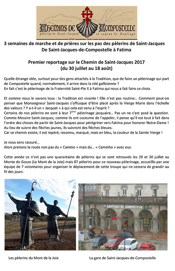 Depuis 2004, Pèlerinage de Tradition et la Fraternité Saint-Pie X organisent tous les deux ans un tronçon du chemin de Saint-Jacques proposant notamment la présence de prêtres pour la célébration de la messe et des confessions. Cette année, les pèlerins sont parti de Saint Jacques pour relier Fatima :