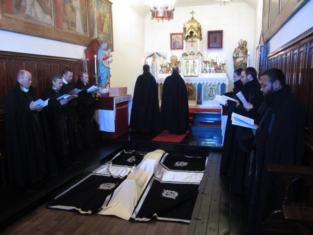 Très beau rituel de profession. La communauté chante le Veni Creator, le novice prosterné se prépare à mourir au monde