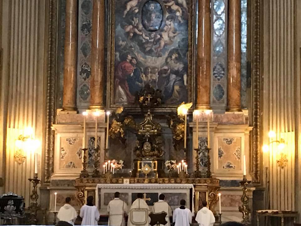 Samedi 16 septembre, le Pèlerinage Summorum Pontificum poursuit ses pérégrinations romaines par une adoration matinale à la Chiesa Nuova présidée par l’abbé Jean-Cyrille Sow, Fraternité Saqint-Pierre, curé de la Paroisse personnelle de la Trinité des Pèlerins à Rome.