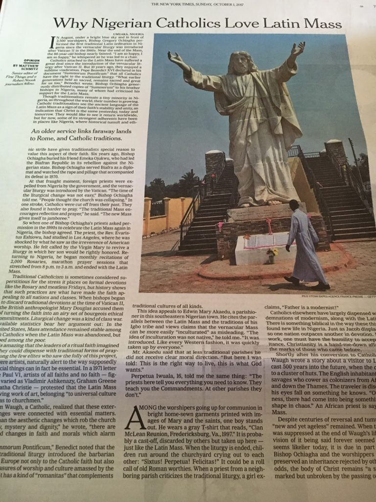 Nous avons relayé l’annonce puis les photos de l’ordination de l’abbé Charles Ike. Notre confrère Rorate Caeli a relevé que les New York Times dans son édition de dimanche 1er octobre a consacré un article complet au regain de la forme extraordinaire (y compris en Afrique) et à cette ordination en particulier.