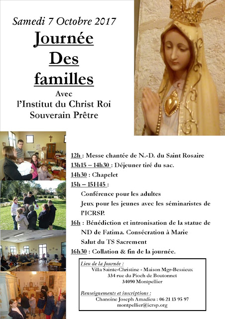 Accueil » Nos archives » Journée des familles à Montpellier le 7 octobre Non classifié(e) Journée des familles à Montpellier le 7 octobre L’Institut du Christ Roi à Montpellier vous convie à leur journée des familles ce 7 octobre Contact Article précédentIl y a 40 ans naissait le MJCF ! Article suivantLe cardinal Ricard et la Fraternité Saint Pie X 6 octobre 2017