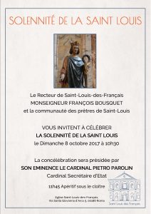 Le cardinal Pietro Parolin, secrétaire d’État du Saint-Siège, a célébré dimanche la fête patronale de Saint-Louis-des-Français, l’église nationale française à Rome qui fêtera en 2018 les 500 ans du début de sa construction. Revenant sur la figure de Saint Louis, le « numéro 2 » du Vatican a souligné que, en le canonisant, l’Église n’avait pas voulu canoniser un régime politique mais « son union à Jésus dans l’exercice des responsabilités ».