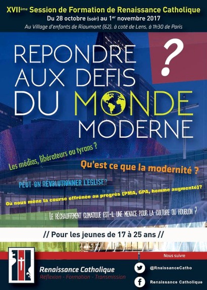C’est pour tenter d’éclaircir nos consciences de jeunes français et chrétiens, que Renaissance Catholique nous propose quatre jours de formation d’amitié et de prières, sur le thème Répondre aux défis du monde moderne