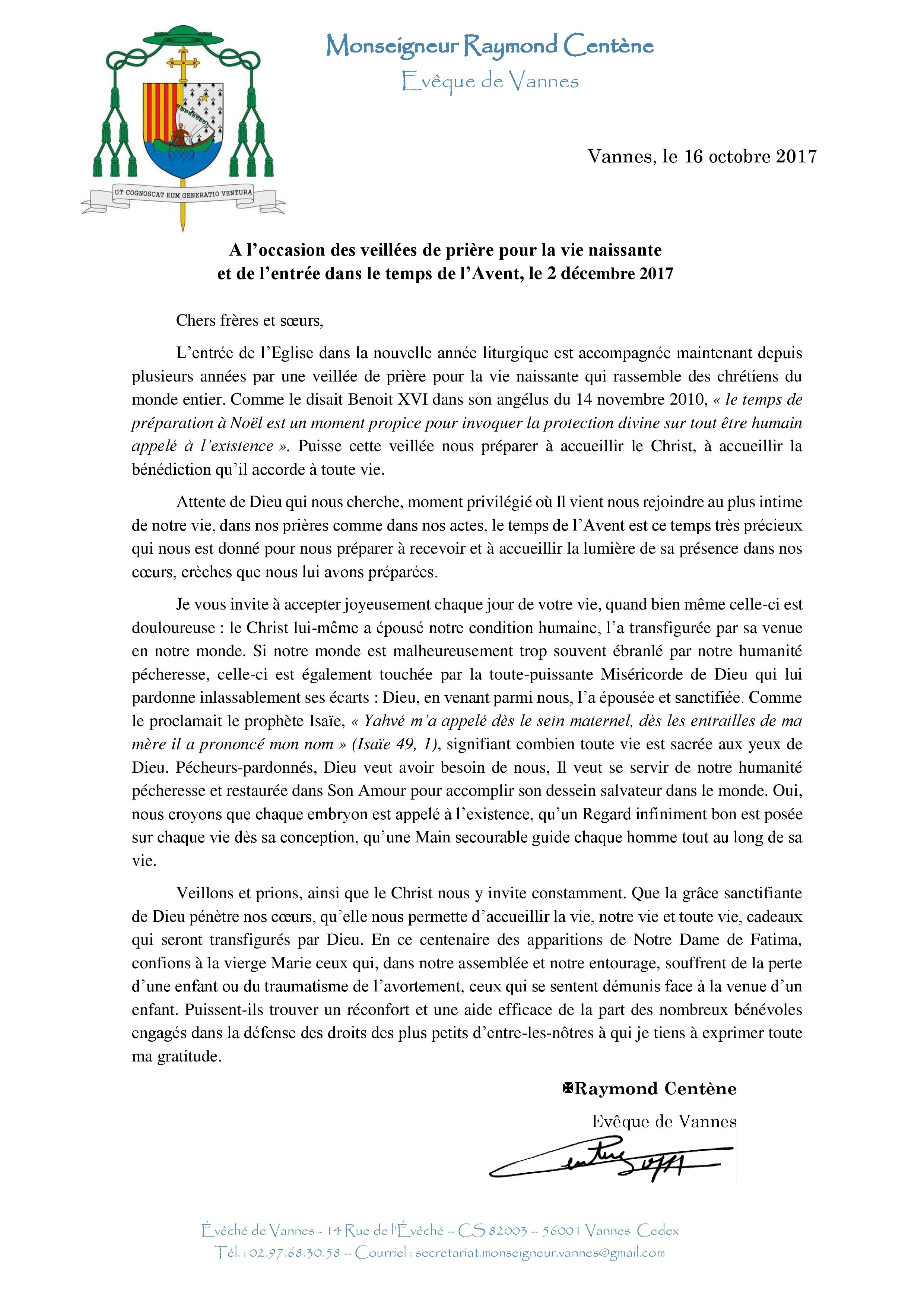 L’évêque de Vannes, Mgr Centène, a publié une lettre pour ces veillées du 2 décembre :