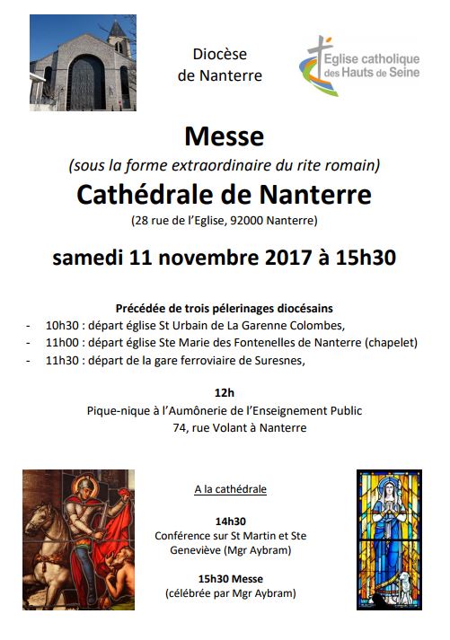 Un lecteur nous invite à transmettre les informations pour le Pèlerinage à Nanterre à l’occasion de la Saint-Martin le 11 novembre. Départ en 3 pèlerinages diocésains depuis La Garenne-Colombe, Suresnes et Nanterre qui s’achèveront par une conférence et une messe en la forme extraordinaire en la Cathédrale Sainte Geneviève – Saint Maurice de Nanterre
