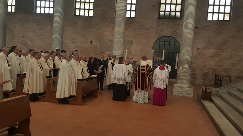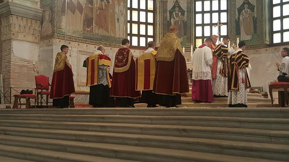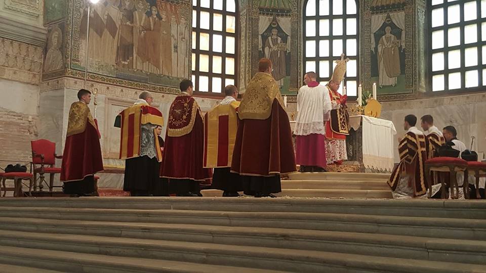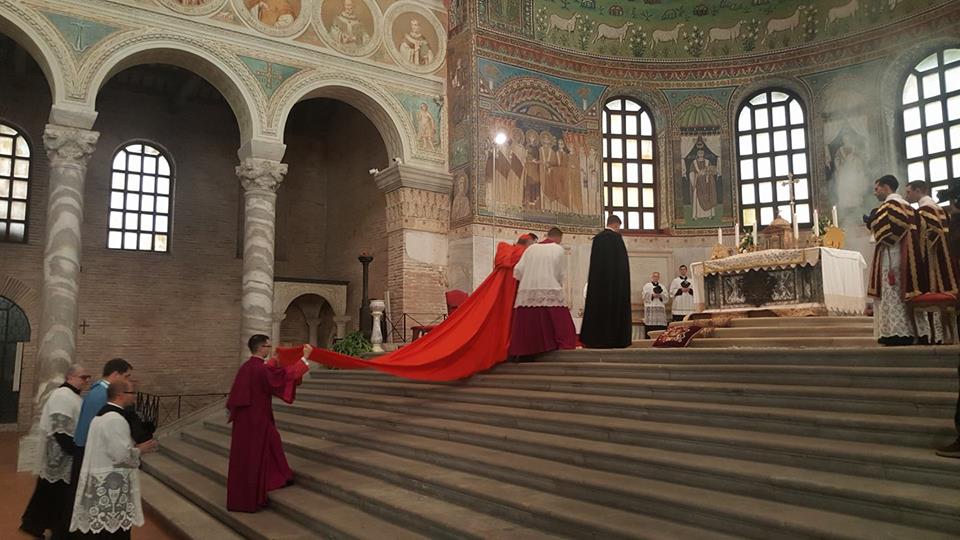 Notre confrère Messa In Latino propose un reportage sur la messe célébrée dimanche 28 octobre à la Basilique Saint-Apollinaire in Classe de Ravenne par SE le Cardinal Raymod Leo Burke. Cette messe pontificale du dimanche du Christ Roi était célébrée à l’occasion du premier pèlerinage régional des groupes stables « Summorum Pontificum » organisée par la Section de l’Emilie-Romagne de la coordination nationale des Summorum Pontificum (CNSP), en collaboration avec le groupe stable « cardinal Domenico Bartolucci » à Ravenne et l’Association culturelle « San Michele Arcangelo » pour les 10 ans de la lettre apostolique Summorum Pontificum. De nombreux prêtres et religieux étaient présents.