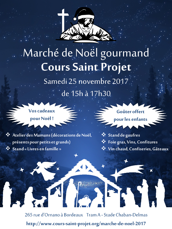 Accueil » Nos archives » Marché de Noël 2017 : Cours Saint-Projet (Bordeaux) le 25 novembre Summorum Pontificum Marché de Noël 2017 : Cours Saint-Projet (Bordeaux) le 25 novembre Marché de Noël du Cours Saint-Projet à Bordeaux le 25 novembre Cours Saint-Projet Vous êtes nombreux à nous transmettre vos annonces pour les Marchés de Noël de vos écoles Summorum Pontificum, comme les années passées nous les diffuserons ! Article précédentZenit se met à l'écriture inclusive ? Article suivantMarché de Noël 2017 : Collège Saint-Padre Pio (Saint-Maur) le 25 novembre 13 novembre 2017