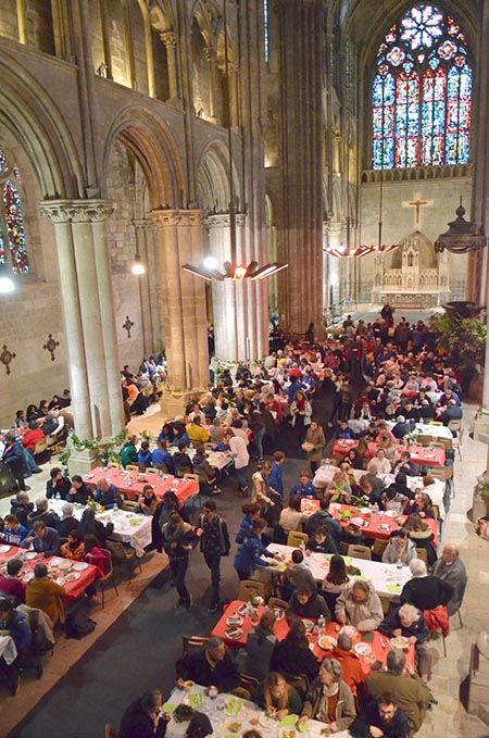 Accueil » Nos archives » Manger dans les églises Perepiscopus Manger dans les églises Cette fois ce n’est pas une idée de Stéphane Bern, mais de Mgr Aubertin, archevêque de Tours. C’était table ouverte en l’église St-Julien, où étaient conviées les personnes à la rue ou en situation difficile. Article précédentPayer pour entrer dans une cathédrale ? Article suivantBurke : l’ultime appel au pape ! 14 novembre 2017