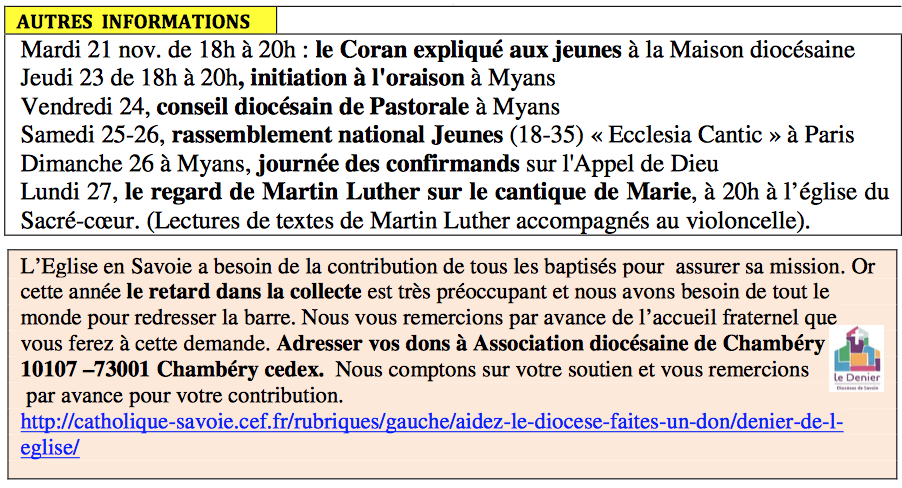 - lundi 27 nov à 20h : le regard de Martin Luther sur le cantique de Marie à l’église du Sacré Cœur.