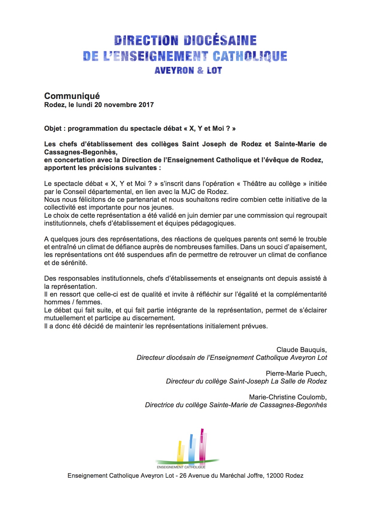 Aveyronnais de naissance et de coeur, je suis triste d’apprendre que le directeur de l’enseignement catholique et donc (?) l’évêque de Rodez aient cru bon de se croire « dans le vent » en cautionnant la diffusion d’une pièce de théâtre engagée et précisément sujette …. à caution.