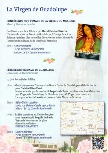 Le dimanche 10 décembre 2017, à partir de 15 h 30, la fête de Notre Dame de Guadalupe aura lieu à l’église Saint-Eugène. Elle sera notamment ponctuée par la célébration selon la forme extraordinaire en l’honneur de cette fête qui honore l’apparition de la Vierge à Guadalupe. Une grand-messe sera célébrée par l’abbé Gabriel Diaz-Patri, à 16 heures. Riposte catholique relaye bien volontiers cette information. En outre, une conférence sur l’image de la Vierge du Mexique sera donnée le mardi 5 décembre 2017, à 20, au centre Bergère (9, rue Bergère – 75009 Paris).