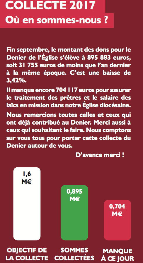 Ce résultat d’exploitation négatif est, comme l’année dernière, compensé par des ressources aléatoires : legs, produits nanciers. même si ce résultat s’améliore, le Denier de l’église, qui est la principale ressource du diocèse, doit rester à un niveau suffisant pour assurer le financement des missions pastorales du diocèse.