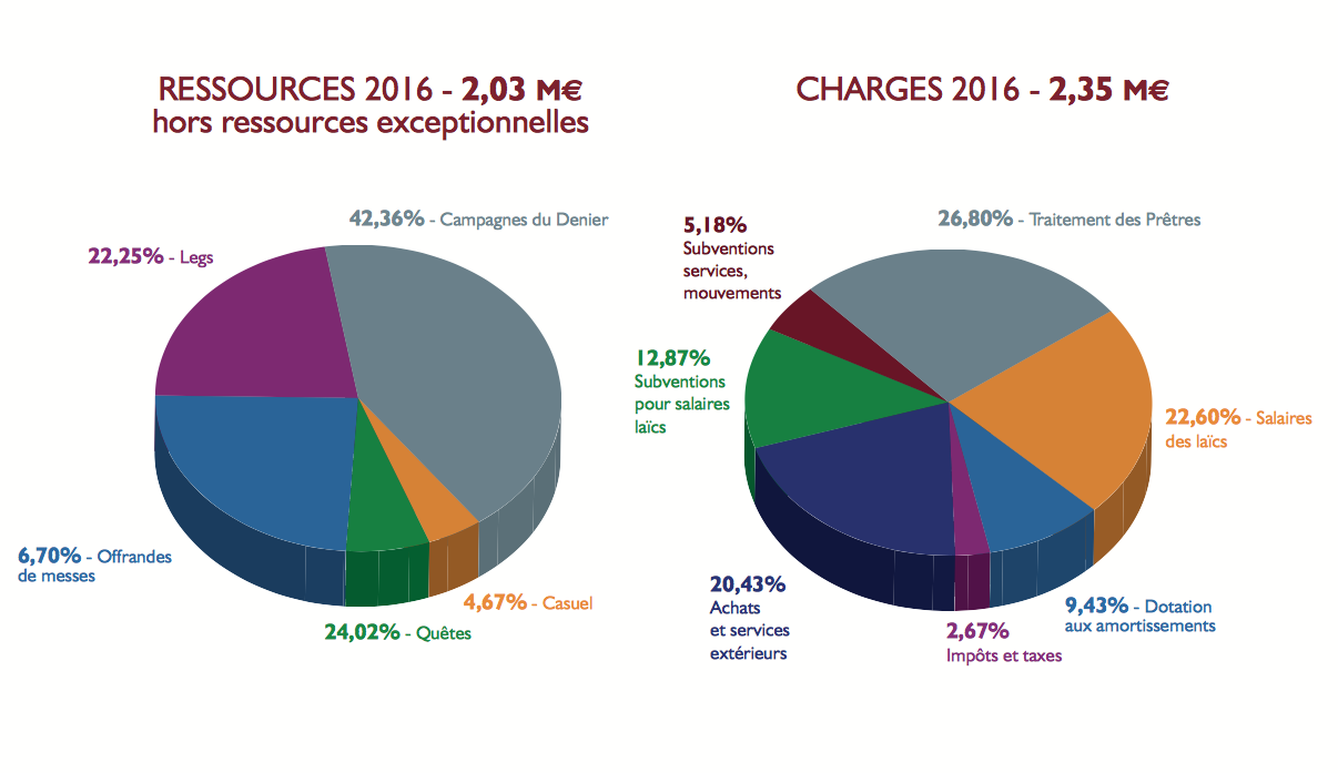 En 2016, les charges de fonctionnement du diocèse de Saint-Claude (sans les dépenses des paroisses) se sont élevées à 2,35 millions d’euros après la neutralisation des transferts de charges. Ce chiffre est en baisse de 17 000 euros par rapport à l’année 2015. Si l’on intègre les comptes des paroisses, les charges de fonctionnement 2016 s’élèvent à 3,92 millions d’euros, en baisse de 131 000 euros par rapport à 2015. La maîtrise des dépenses se poursuit en 2016 grâce aux décisions de gestion prises en 2015 et dans les années précédentes.