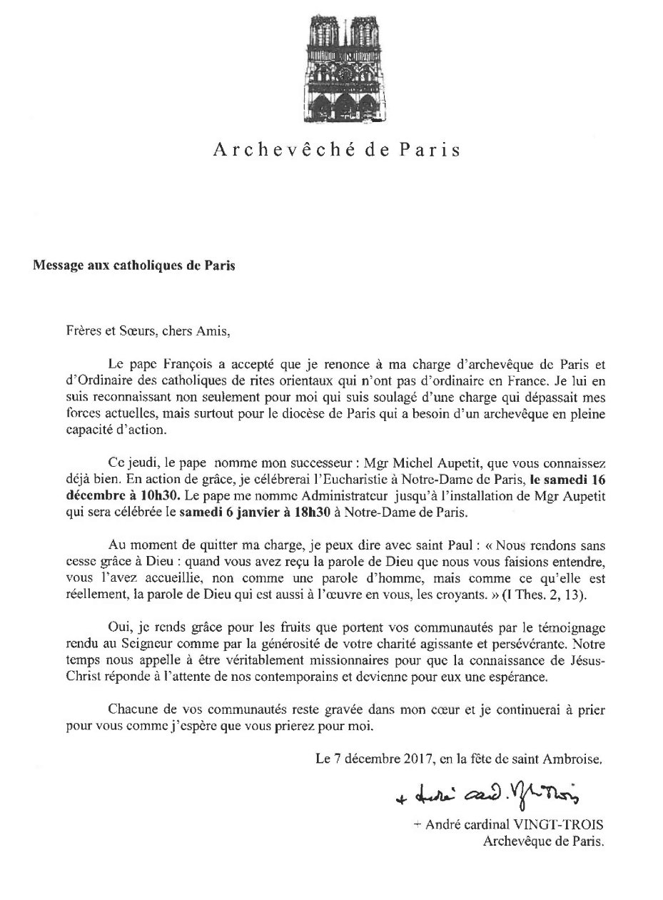 Accueil » Nos archives » La lettre d’adieu du cardinal Vingt-Trois Perepiscopus La lettre d’adieu du cardinal Vingt-Trois Article précédentPremier entretien du nouvel archevêque de Paris Article suivantLe pitoyable spectacle offert aux chrétiens d'Orient 7 décembre 2017