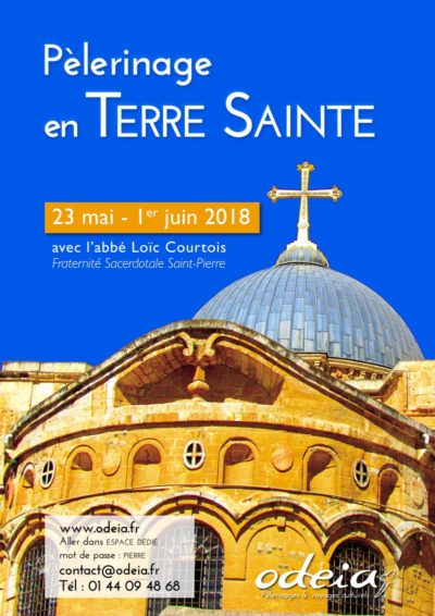 Ce pèlerinage, accompagné par l’abbé Loïc Courtois de la Fraternité Saint-Pierre, vous transportera dans les terres foulées par Notre-Seigneur : Bethléem, Nazareth, Jérusalem, Béthanie et encore d’autres hauts lieux des origines du christianisme.