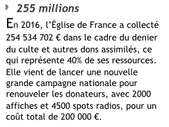 Si certains évêques étaient un peu intelligents, ils ne se contenteraient plus d’un service minimum et essaieraient de réfléchir un tant soit peu. C’est quand même bizarre que les instituts éclissa Dei fassent le plein dans leurs séminaires, que la FFSPX fasse aussi le plein et que eux ont du mal à avoir au minimum 1 ou 2 séminaristes sauf très rares exceptions comme Toulon par ex (mais il faut savoir pourquoi?) et tout se tient: parce que la formation laisse à désirer donc le service aux ouailles laisse à désirer etc c’est pourquoi le denier du culte ne rentre pas. Service minimum donc denier du culte minimum; On argumentera qu’il n’y a pas bcp de prêtres Pourquoi ? Messeigneurs soyez un peu moins intolérants envers les vrais catho et vous aurez tout à y gagner et remettez Dieu au centre de la Vie place qu’il n’aurait jamais dû quitter, faites prier le chapelet remettez à l’honneur l’adoration et faites remettre vos ouailles à genoux et vous verrez que tout changera.