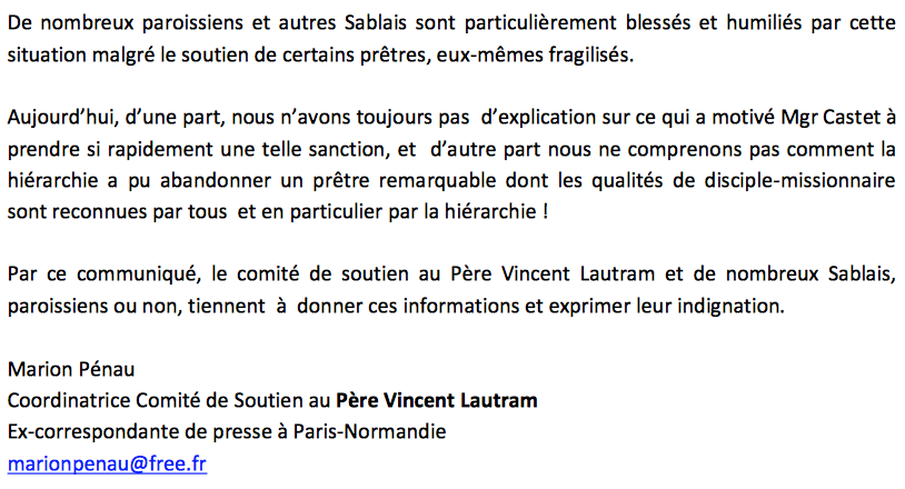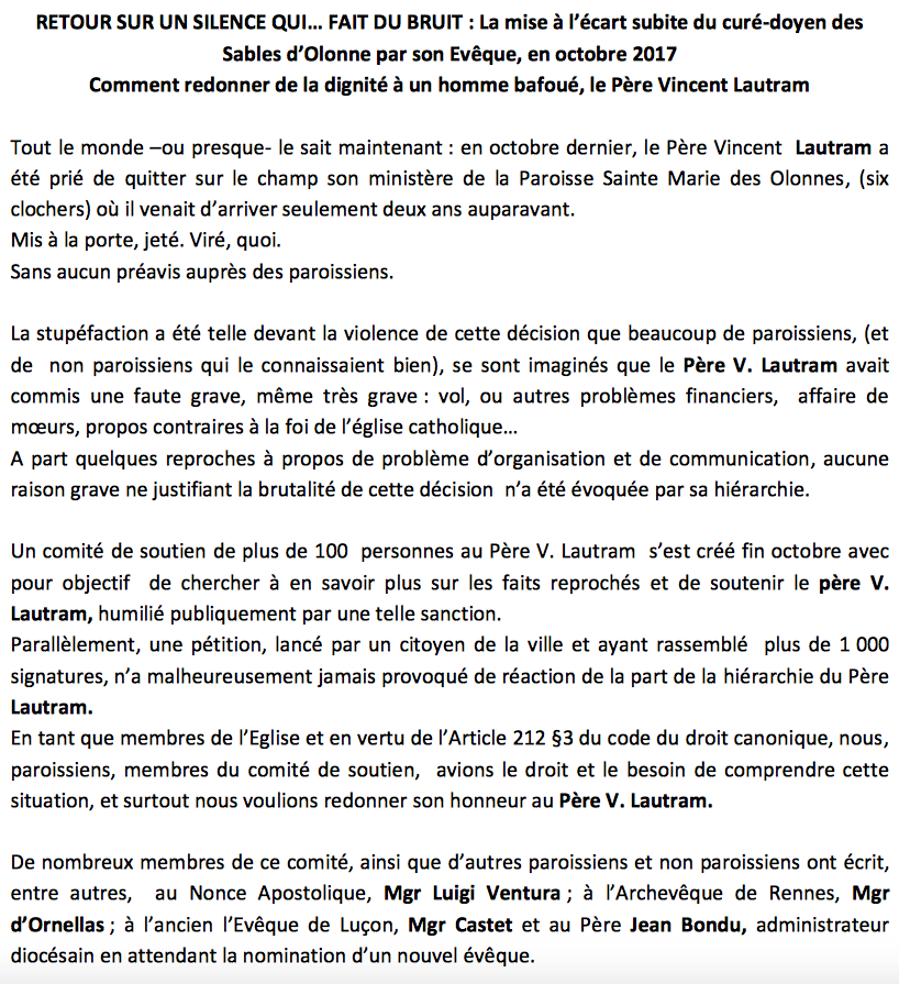 Perepiscopus avait évoqué en octobre dernier le limogeage d’un curé en Vendée, peu de temps avant la démission de Mgr Castet. Cette éviction continue de provoquer des remous. L’abbé Lautram était apprécié au point qu’un comité de soutien au Père Vincent Lautram a été constitué et publie le communiqué suivant :