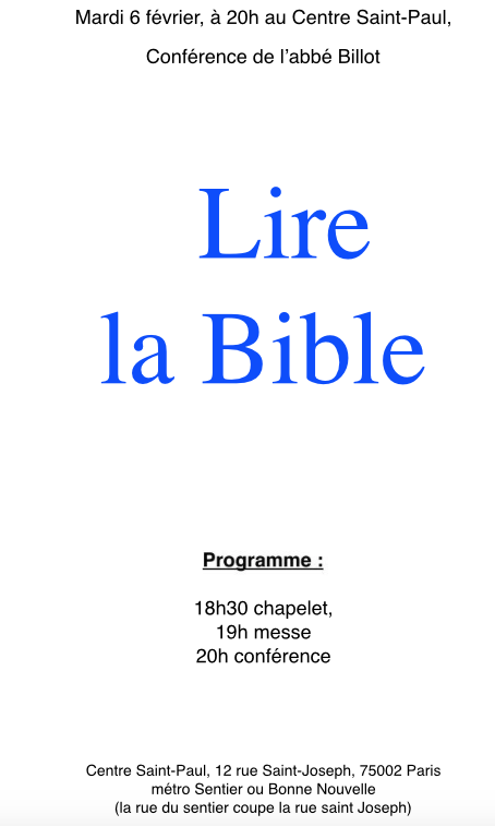Accueil » Nos archives » Conférence sur la Bible à Paris le 6 février Summorum Pontificum Conférence sur la Bible à Paris le 6 février Dans le cadre des conférences du mardi du Centre Saint Paul à Paris Centre Saint-Paul Article précédentUn nouveau site pour la Fraternité Saint-Pie X à Nantes Article suivantMgr Percerou adresse une fin de non-recevoir aux Scouts d'Europe 5 février 2018