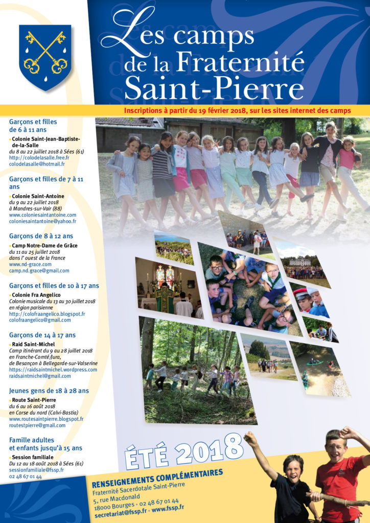 Comme chaque année depuis sa fondation, le District de France de la Fraternité Saint-Pierre propose des camps, colonies ou routes d’été pour les jeunes. Cette année est également proposé une session pour familles à Sées au mois d’août.
