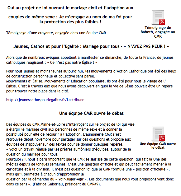 L’article date du 22 mars 2013 mais il ressort à l’aune des scandales récents. Quand ces gens là demandent à ouvrir le dialogue, ils viennent simplement contester l’anthropologie chrétienne. Imaginons un peu des chrétiens demandant d’ouvrir le dialogue sur le mystère de la Sainte Trinité, le dogme de l’Incarnation, de l’Immaculée Conception, de la Résurrection, de la Présence Réelle, etc…