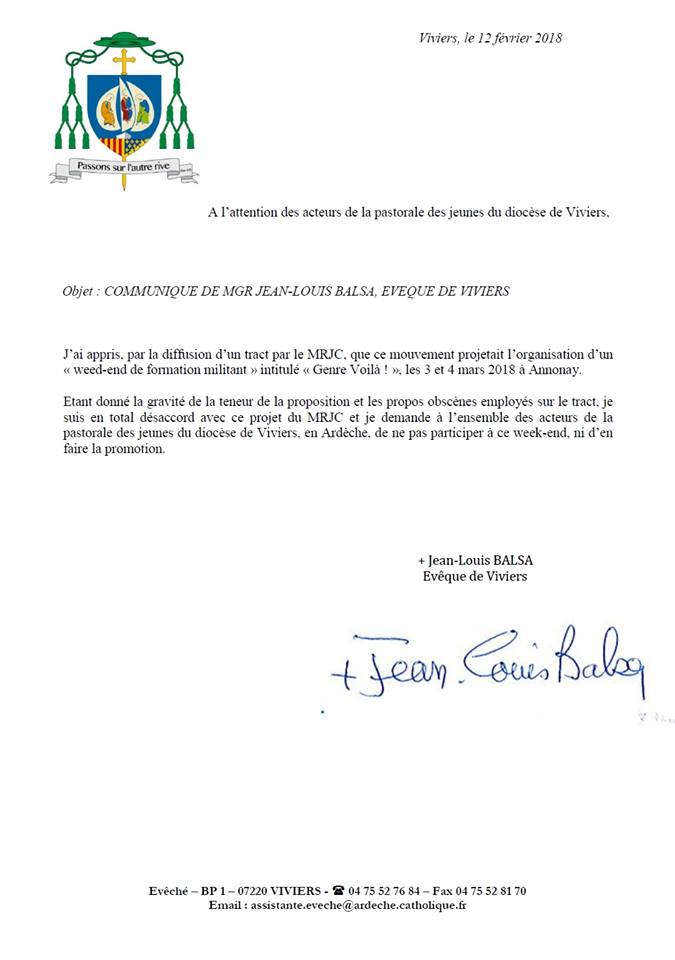 Accueil » Nos archives » Mgr Balsa en total désaccord avec le MRJC En Une Mgr Balsa en total désaccord avec le MRJC Courrier intéressant d’un évêque qui n’est pas réputé être un dangereux réactionnaire : Article précédentUne piste de ski au Séminaire de Courtalain ?? Article suivantBioéthique : Macron reçoit les religions 12 février 2018