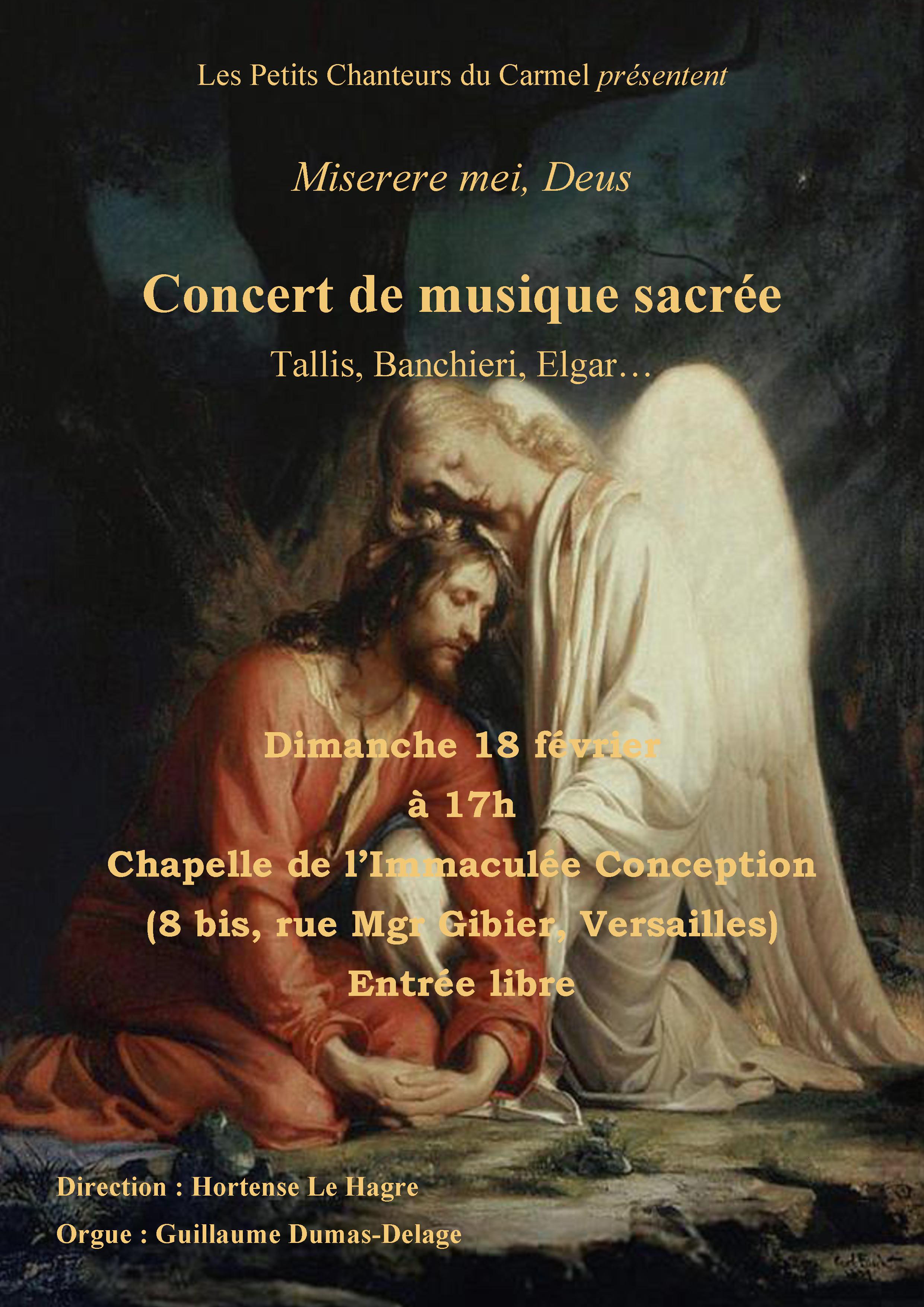Pendant le Carême, plusieurs concerts spirituels sont proposés à la Chapelle de l’Immaculée Conception (FSSP à Versailles), ces concerts sont suivis des Vêpres et du Salut du Saint Sacrement à 18h00