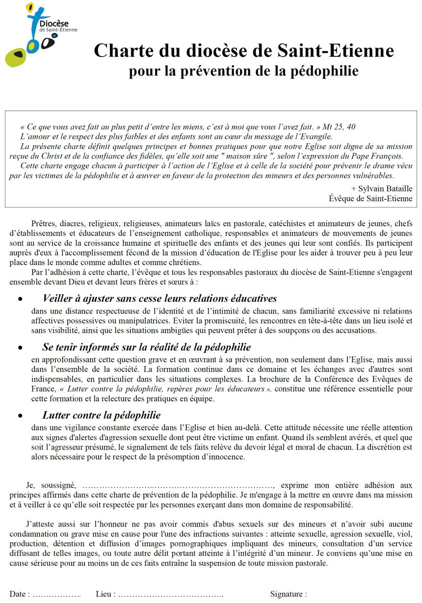 Accueil » Nos archives » 400 prêtres et laïcs obligés de signer la charte de prévention de la pédophilie Perepiscopus 400 prêtres et laïcs obligés de signer la charte de prévention de la pédophilie Dans le diocèse de Saint-Etienne : Article précédentLe tract du MRJC Article suivantQue se passera-t-il au prochain chapitre général de la Fraternité Saint-Pie X ? 15 février 2018