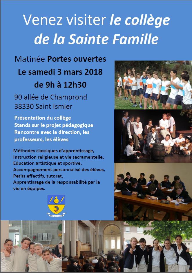 Accueil » Nos archives » Matinée porte-ouverte au Collège de la Sainte Famille (Grenoble) le 3 mars Summorum Pontificum Matinée porte-ouverte au Collège de la Sainte Famille (Grenoble) le 3 mars Le samedi 3 mars aura une matinée porte-ouverte au Collège de la Sainte Famille à Saint-Ismier (Grenoble). Collège de la Sainte-Famille (Saint-Ismier) Article précédentMRJC : nous attendons de nos évêques une réaction de grande fermeté Article suivant40 Days for Life : 49 bébés déjà sauvés ! 20 février 2018