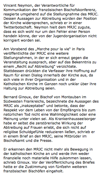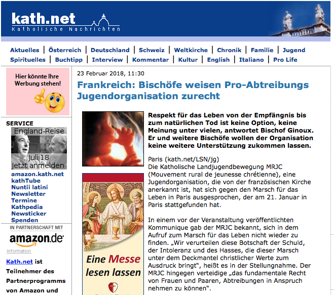 Accueil » Nos archives » Le scandale du MRJC dans la presse allemande En Une Le scandale du MRJC dans la presse allemande Après la presse pro-vie américaine, c’est au tour d’un média catholique allemand de relater le scandale du MRJC et l’attitude équivoque de l’épiscopat français. Pour les germanistes, voici l’article : Article précédentLe pape va recevoir la famille d’Asia Bibi Article suivantLa FNOGEC se met à l'écriture inclusive 23 février 2018