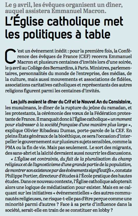 L’arrivée de Mgr Michel Aupetit serait-elle marquée par la fin de cette culture de la soumission, qui entraîne l’Eglise qui est en France à subir les évènements et à ne leur opposer qu’une maigre opposition ? Quoi qu’il en soit, l’organisation de ce dîner, un peu sur le modèle du CRIF, est certainement une bonne nouvelle pour remettre l’Eglise au centre du village. Voici ce qu’en écrit La Vie du 22 février :