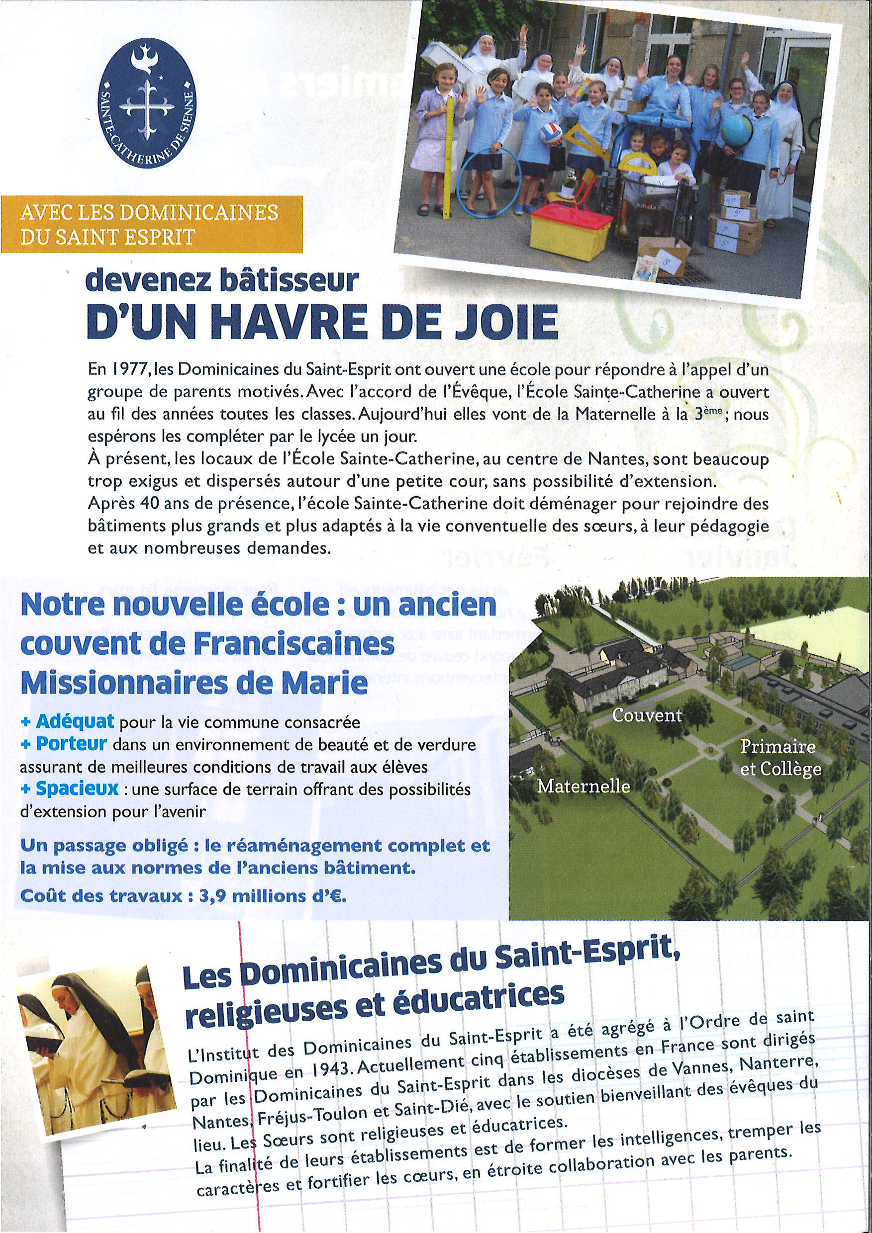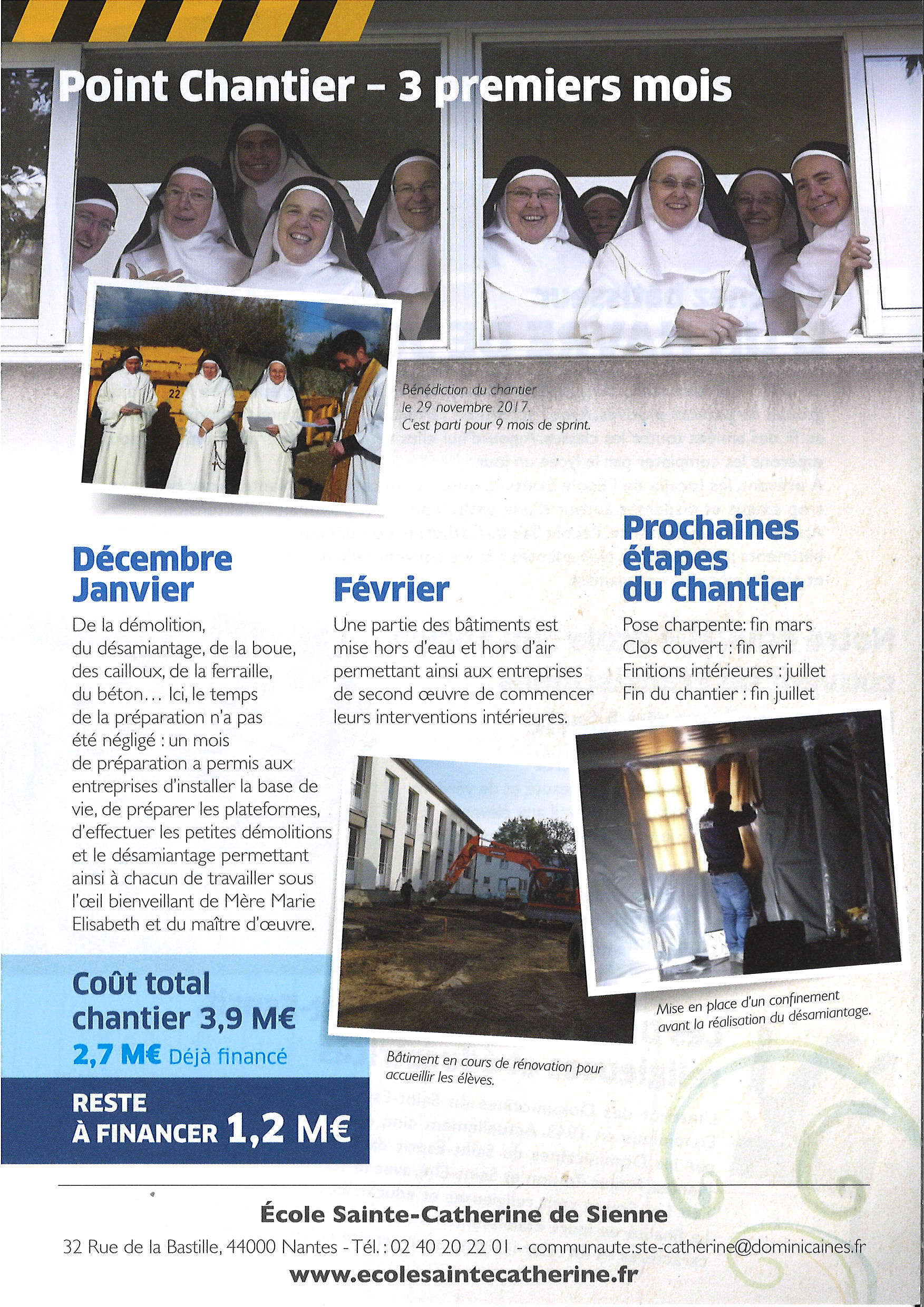 Nous avons déjà évoqué le projet de déménager de l’Ecole Sainte Catherine de Sienne à Nantes qui va quitter le centre de Nantes. Les travaux ont commencé… un lecteur nous a fait suivre les nouvelles du chantier !