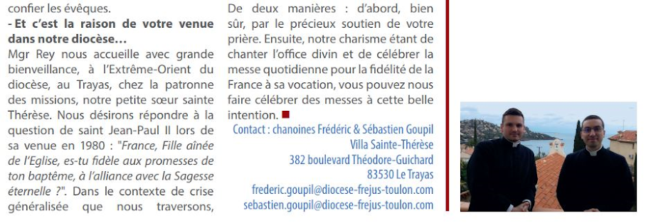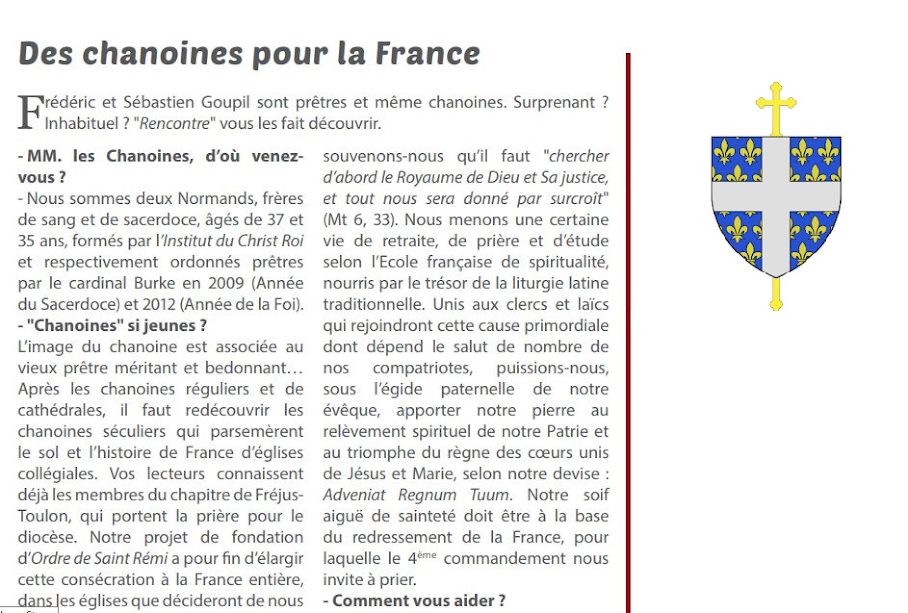 Notre confrère le Salon Beige diffuse un article du journal diocésain de Fréjus-Toulon. Deux jeunes prêtres venant de l’Institut du Christ Roi fondent l’Ordre de Saint-Rémi dans le diocèse de Fréjus-Toulon, cette communauté veut prier et faire prier pour la France en se rappelant notamment les paroles du Pape Jean-Paul II au Bourget : « France, Fille aînées de l’Eglise, es-tu fidèle aux promesses de ton baptême, à l’alliance avec la Sagesse éternelle ?« .