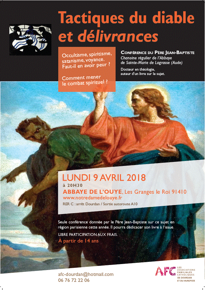 lundi 9 avril à 20H30 à l’Abbaye Notre-Dame de L’Ouye (Dourdan) par le Père Jean-Baptiste, Chanoine régulier de l’Abbaye de Sainte-Marie de Lagrasse (Aude), Docteur en théologie et auteur d’un livre sur le sujet.