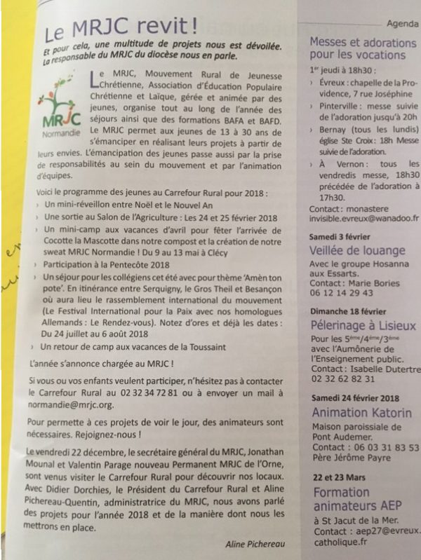 Je ne sais s’il y a un permanent du MRJC dans le diocèse d’Evreux, mais l’article dont vous publiez la photocopie parle d’un permanent du MRJC dans l’Orne, c’est à dire dans le diocèse de Séez.