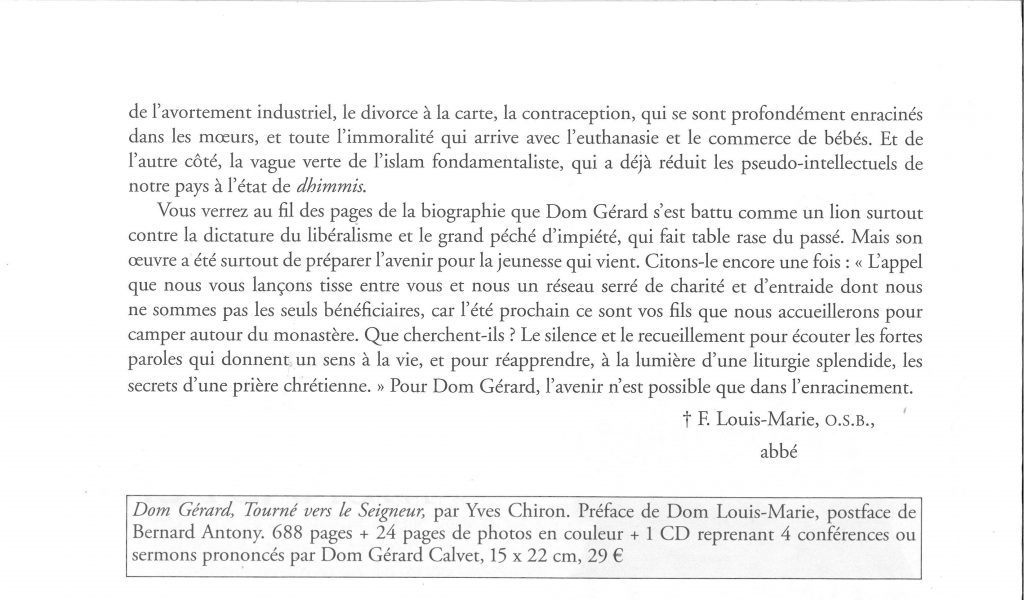 Yves Chiron vient de publier un très bel ouvrage sur Dom Gérard Calvet, abbé fondateur de l’Abbaye Sainte Madeleine du Barroux rappelé à Dieu en 2008. Cette biographie retrace le parcours exceptionnel d’un moine qui voulait juste continuer à vivre dans la tradition bénédictine.