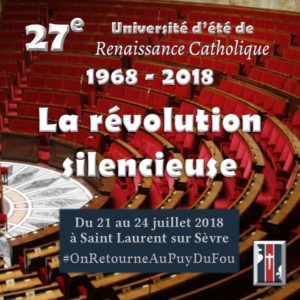 La 27è université d’été de Renaissance Catholique aura lieu entre le 21 et le 24 juillet sur le thème « La révolution silencieuse ». Elle aura lieu à Saint-Laurent sur Sèvre avec un pèlerinage sur la tombe de Saint Louis-Marie Grignon de Montfort et une journée au Puy du Fou. Il faut souligner la grande qualité, comme chaque année, des interventions (voir programme ci-dessous) et des intervenants.