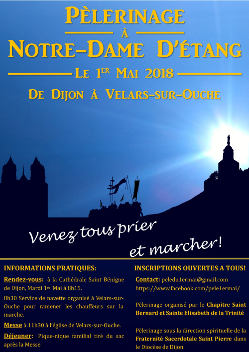 Accueil » Nos archives » Pèlerinage de Dijon à Velars-sur-Ouche Summorum Pontificum Pèlerinage de Dijon à Velars-sur-Ouche Les chapitres Saint-Bernard et Sainte Elisabeth de la Trinité (Notre-Dame de Chrétienté – Région Est) propose un pèlerinage à Notre-Dame d’Etang le 1er mai. L’aumônerie est assurée par la Fraternité Saint-Pierre (Dijon). Article précédentMgr Ginoux soutient Alfie Evans Article suivantFête de la Croix des Vents (Sées) le 10 mai 25 avril 2018
