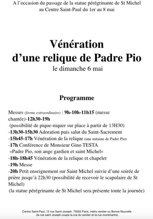 Accueil » Nos archives » Vénération d’une relique de Padre Pio au Centre Saint-Paul (Paris) Summorum Pontificum Vénération d’une relique de Padre Pio au Centre Saint-Paul (Paris) Le Centre Saint-Paul propose la vénération d’une relique de Padre Pio le 6 mai après-midi à Paris ainsi qu’une conférence ‘Padre Pio, son ange gardien et saint Michel’. Article précédentDécouvrez l'école Saint Martial (Limoges) Article suivantImmigrés : Le diocèse de Tours demande l'évacuation de l'église St-Libert 29 avril 2018
