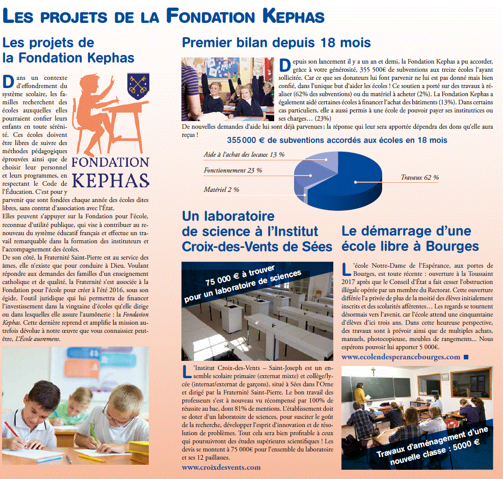 Dans la dernière lettre aux Amis et bienfaiteurs de la Fraternité Sacerdotale Saint-Pierre (District de France) du mois de mai 2018, on peut lire un intéressant bilan de la Fondation Kephas. La Fondation Kephas veut accompagner la création et le développement d’écoles indépendantes et catholiques, dans lesquelles la Fraternité Sacerdotale Saint-Pierre assure le supériorat ou l’aumônerie. Elle est abritée par la Fondation pour l’école, reconnue d’utilité publique.