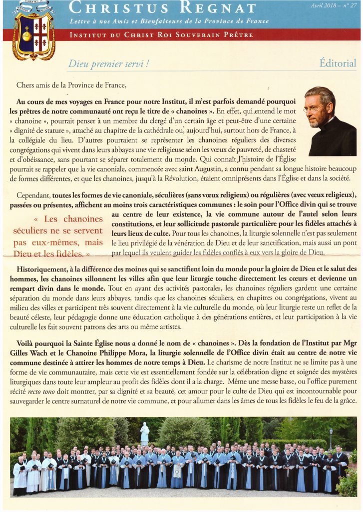 La lettre n°27 des Amis et bienfaiteurs de la Province de France de l’Institut du Christ Roi, Mgr R. Michael Schmitz, provincial de France, évoque le charisme de l’institut du Christ Roi