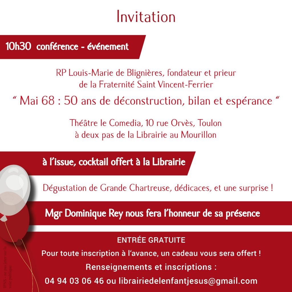 A l’occasion du 5è anniversaire de la Librairie catholique de l’Enfant Jésus, le RP Louis-Marie de Blignières, fondateur et prieur de la Fraternité Saint-Vincent Ferrier, donnera une conférence à Toulon le 26 mai 2018 « Mai 68 : 50 ans de déconstruction, bilan et espérance ».